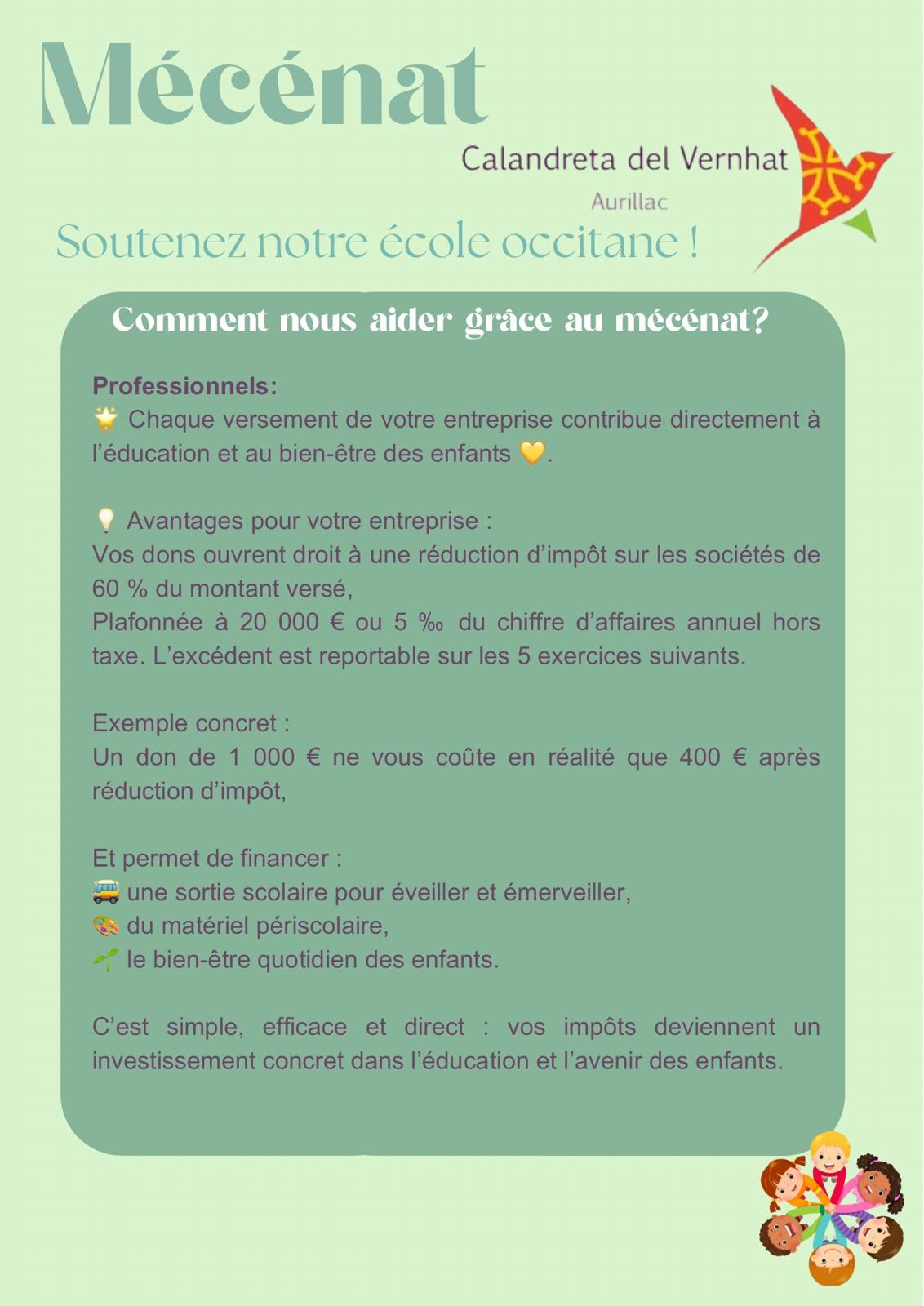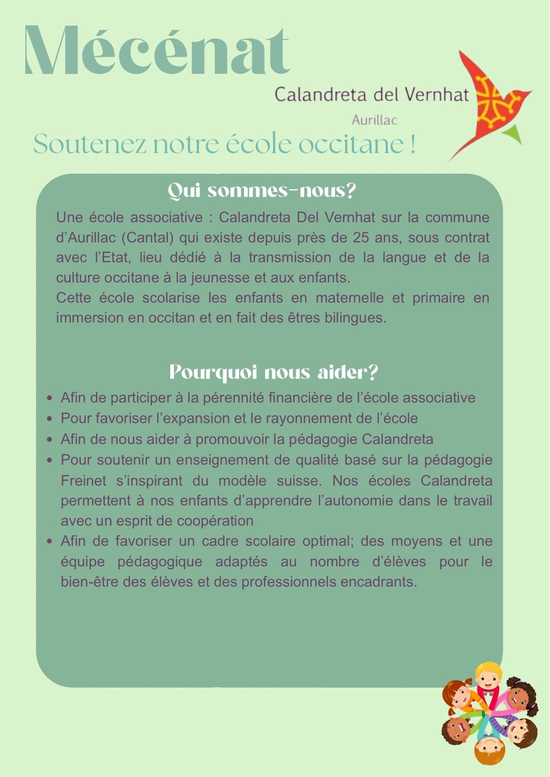 L’école Calandreta del Vernhat porte un projet éducatif associatif, immersif en occitan, fondé sur la transmission, la culture et la réussite de chaque enfant.